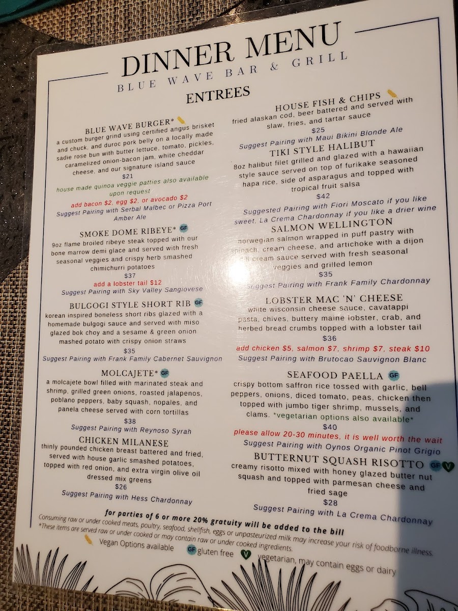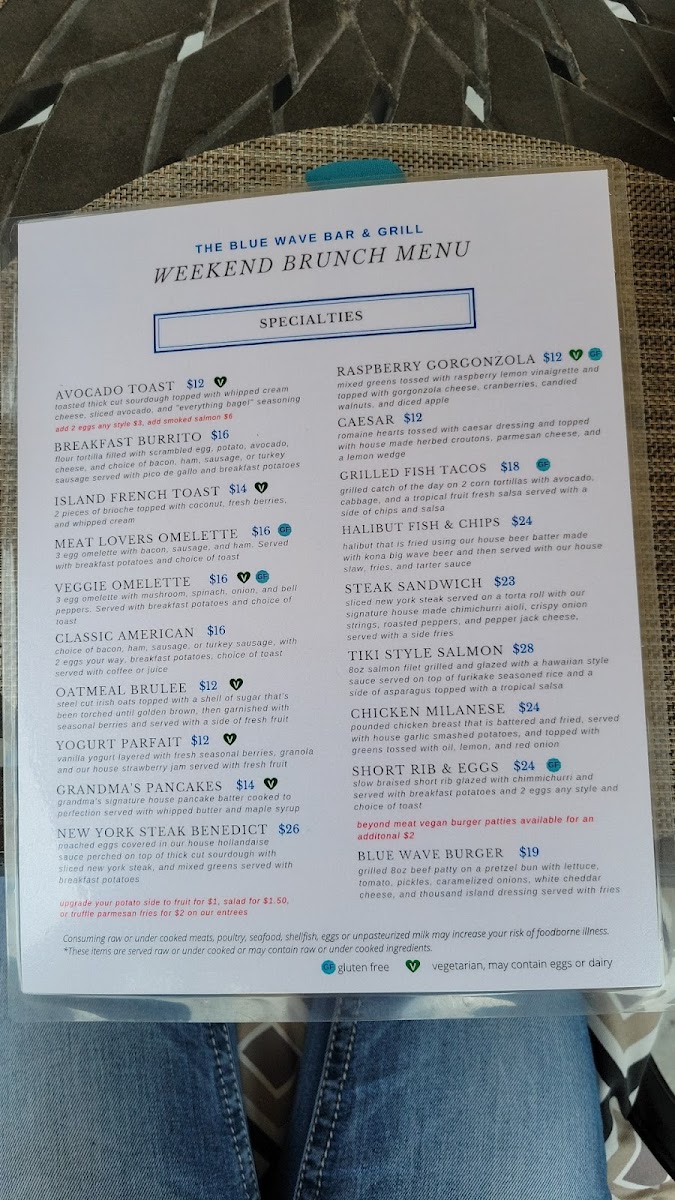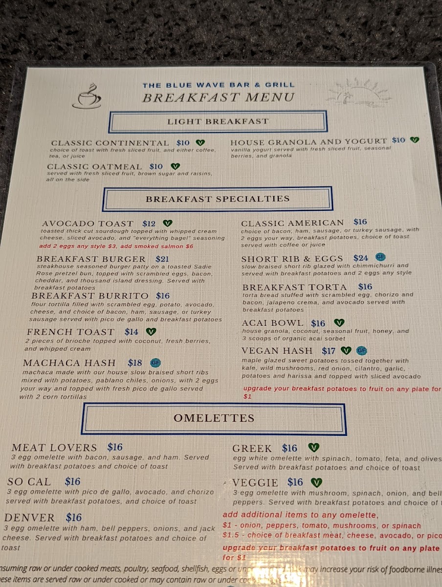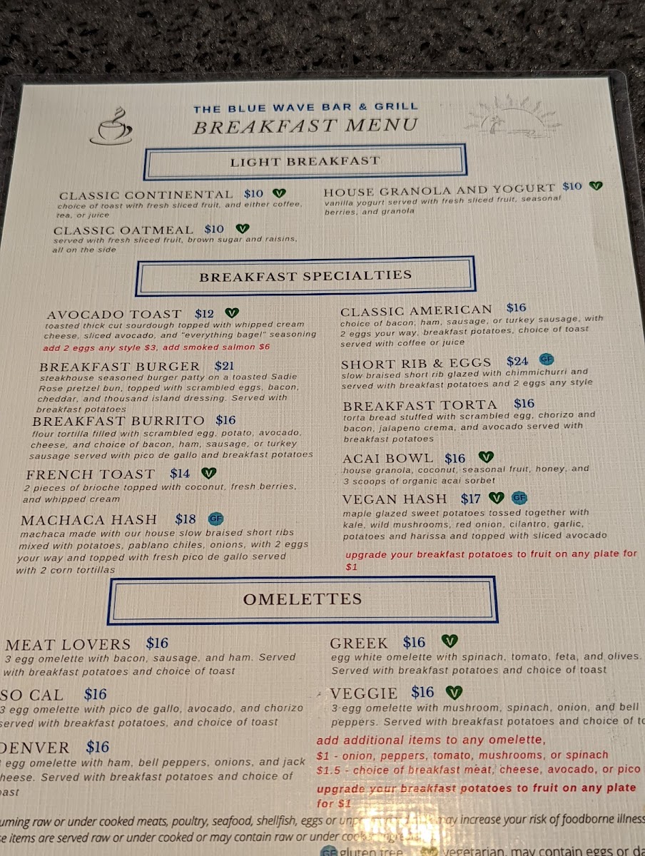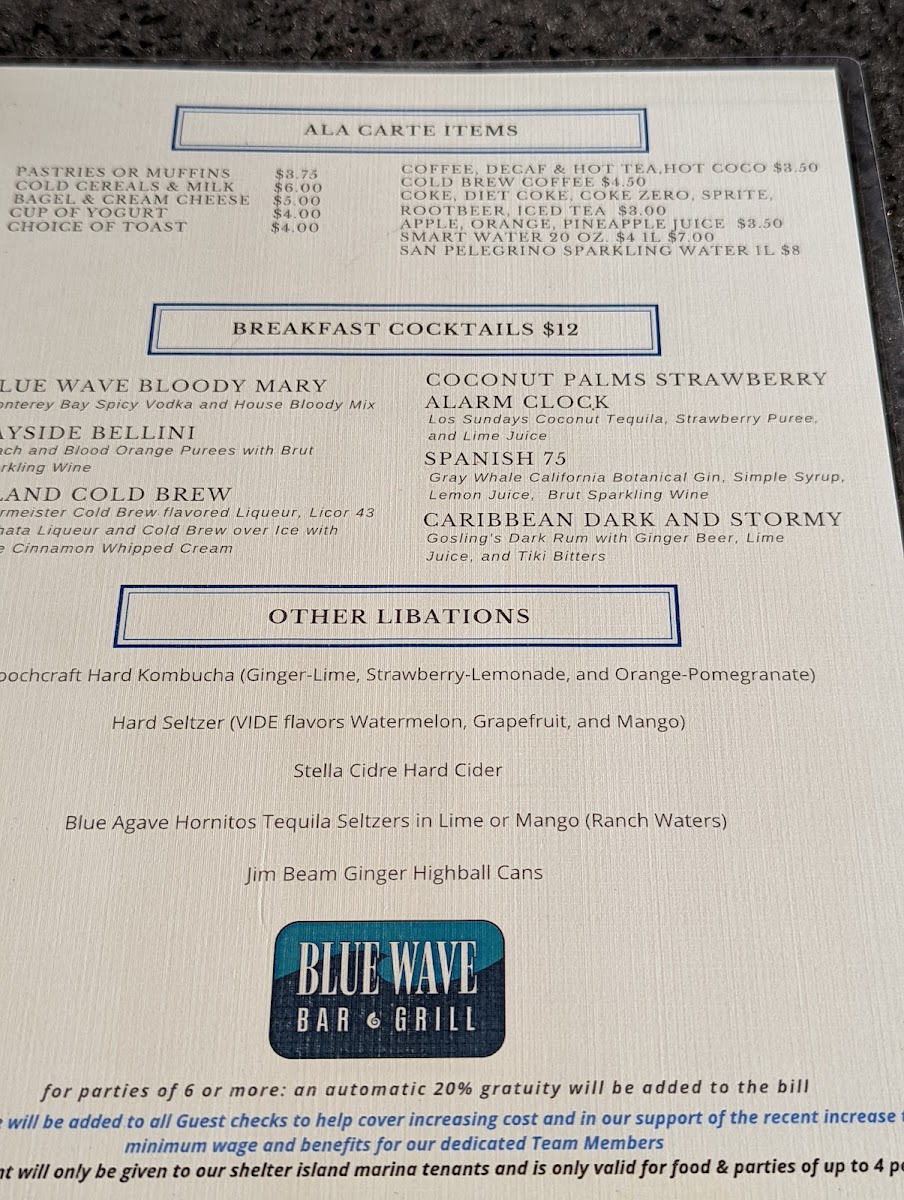 From a reviewer’s perspective, the menu at Blue Wave Bar & Grill, located at 2051 Shelter Island Dr, San Diego, CA 92106, offers a well-rounded and comforting breakfast experience that feels both relaxed and thoughtfully curated. As a conclusion to the overall menu, what stands out most is its balance between simplicity and variety. The A La Carte section allows flexibility with classic staples such as One Egg, Two Eggs, Breakfast Potatoes, Assorted Cold Cereals With Milk, and a refreshing Bowl Of Fruit, making it easy to customize any meal. Beverage options are equally comprehensive, ranging from everyday comforts like Fresh Brewed Ice Tea, Coffee, Decaf Hot Tea, and Hot Chocolate, to a full lineup of juices including Apple, Tomato, Orange, Cranberry, and Pineapple. Those looking for something fizzy can choose from Coke, Diet Coke, Sprite, Root Beer, or Lemonade, while bottled water selections such as Solar Rain, San Pellegrino, and Perrier add a premium touch. The cocktail menu enhances the laid-back, waterfront vibe with brunch-friendly choices like Mimosa By The Bottle, Blue Wave Bloody Mary, Blood Orange Screwdriver, and Irish Coffee. Value-conscious diners will appreciate the Breakfast Value Menu, featuring approachable favorites like Continental, Old Fashioned Pancakes, Cinnamon Raisin French Toast, Chef’s Quiche, and Belgian Waffle. For heartier appetites, the Full Breakfast Specialties Menu delivers classic American comfort through dishes such as Classic American Breakfast, Build Your Own Omelet Or Scramble, Traditional Eggs Benedict, Country Fried Steak, and Corned Beef Hash. Altogether, the menu successfully wraps up the Blue Wave Bar & Grill dining experience by offering something for every morning mood-simple, indulgent, or celebratory-making it a satisfying and memorable way to start the day by the bay.